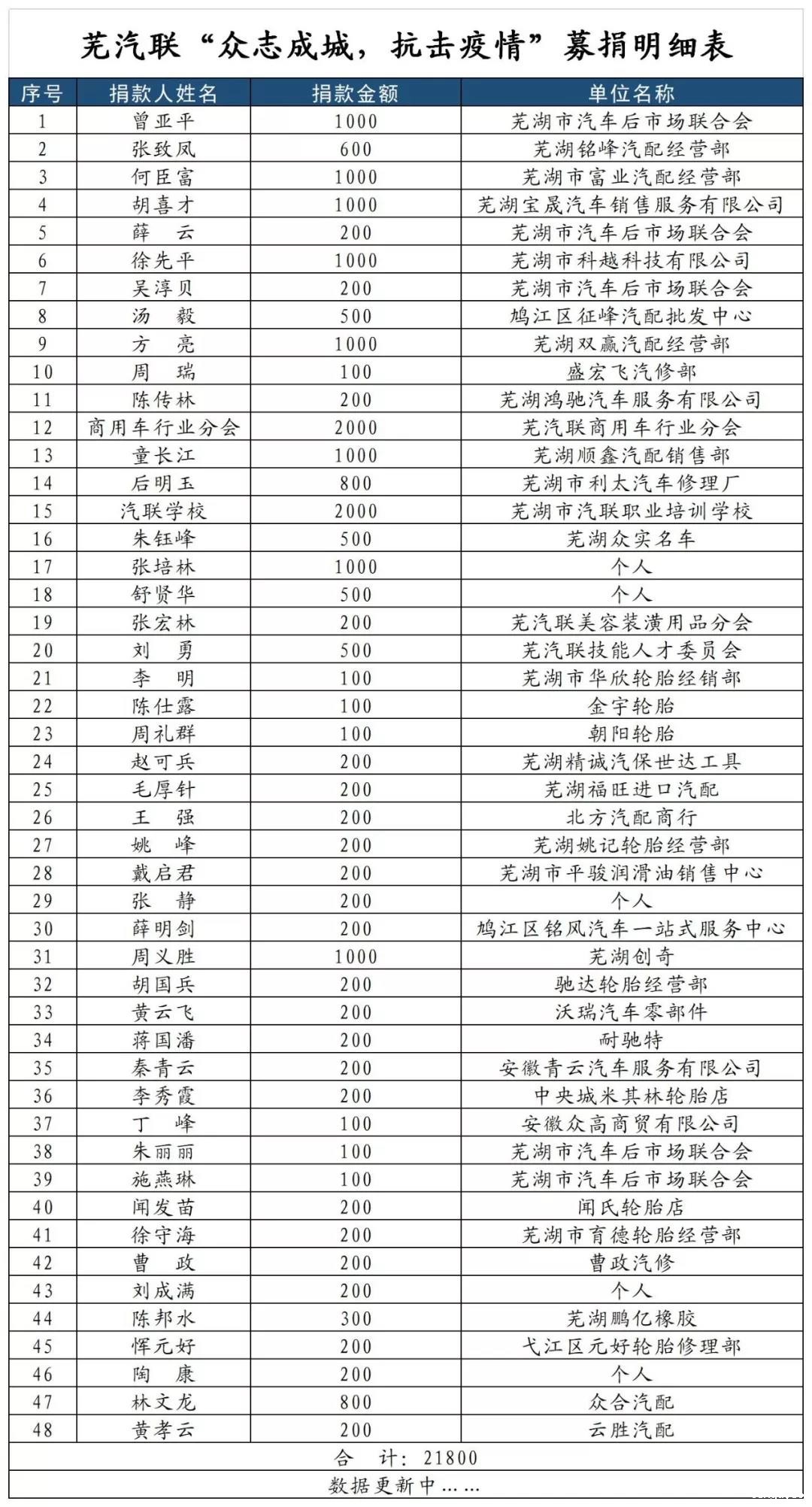 11、安徽芜湖汽车后市场联合会会长曾亚平 捐款1000元