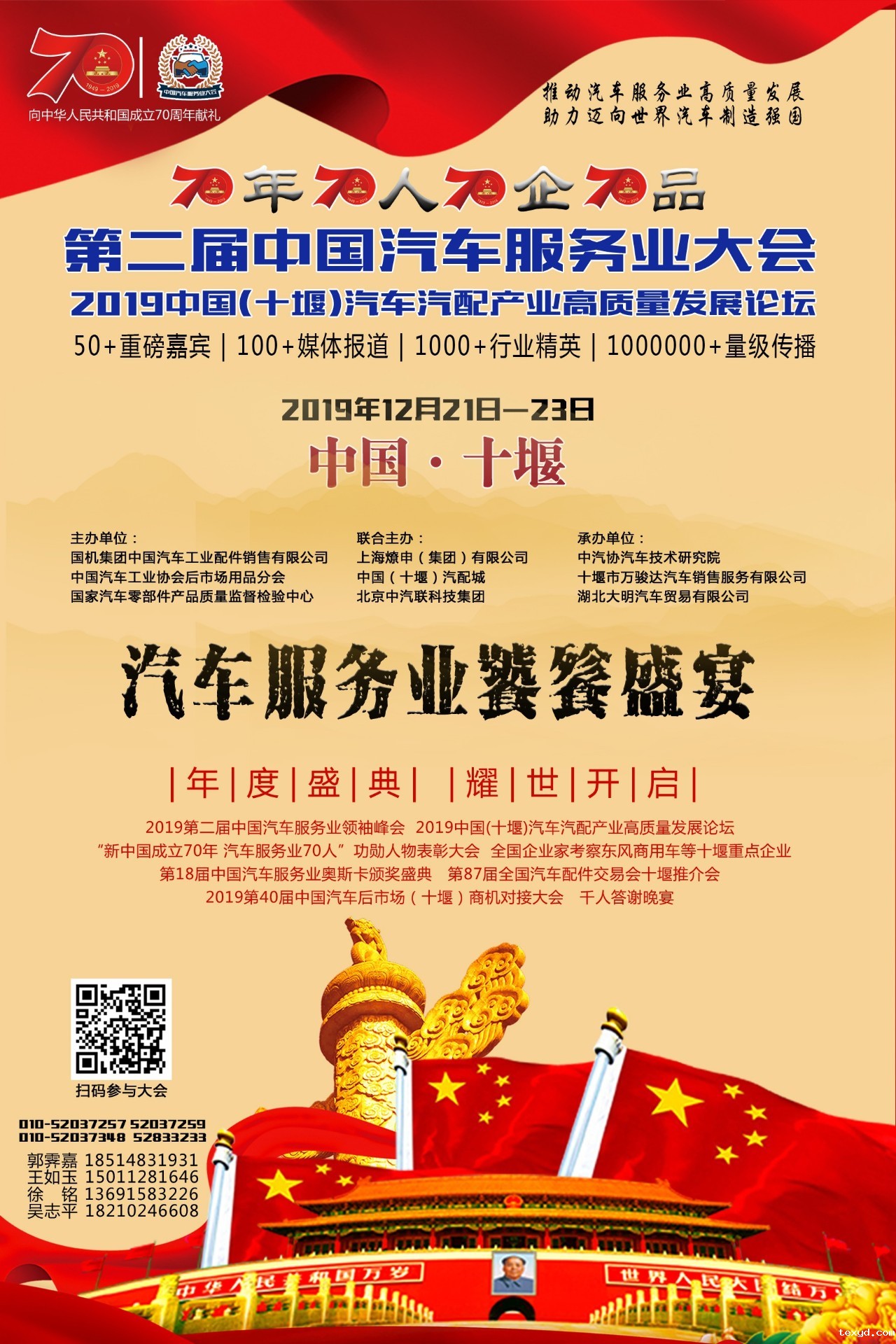 不忘初心,牢记使命。为贯彻落实党的十九大精神,认真贯彻落实《国务院办公厅关于加快发展流通促进商业消费的意见》(国办发〔2019〕42号)和《关于隆重庆祝中华人民共和国成立70周年广泛组织开展“我和我的祖国”群众性主题宣传教育活动的通知》的相关要求,激发和保护企业家精神,壮大企业家队伍,增强企业家信心,进一步推动经济新常态下汽车企业加快发展方式转变,实现高质量发展,举办一堂18luck新利快乐彩“特殊党课”,拟在十堰市人民政府支持下,由中国汽车工业协会后市场用品分会、国机集团中国汽车工业配件销售有限公司、国家汽车零部件产品质量监督检验中心等机构主办的以“新时代、新格局、新使命”为主题的2019第二届中国汽车服务业大会暨中国(十堰)汽车汽配产业高质量发展论坛将于2019年12月21-23日在中国商用车之都、道教圣地湖北十堰市盛大举行。